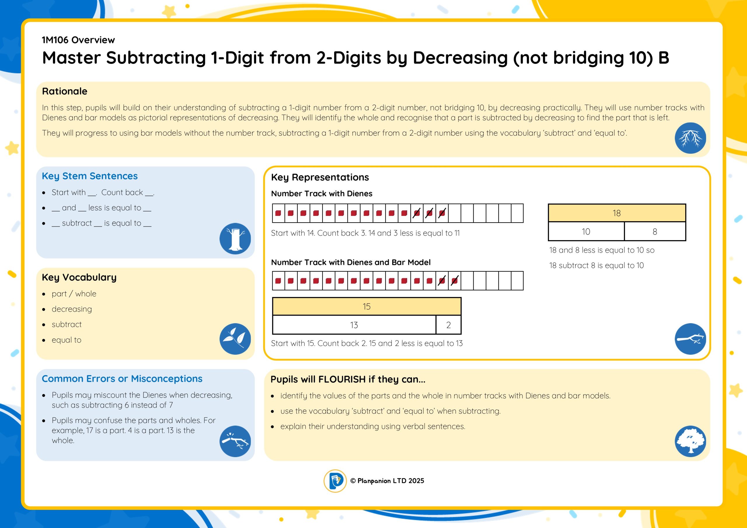 1M105B Master Subtracting 1-Digit from 2-Digits by Decreasing (not bridging 10) B