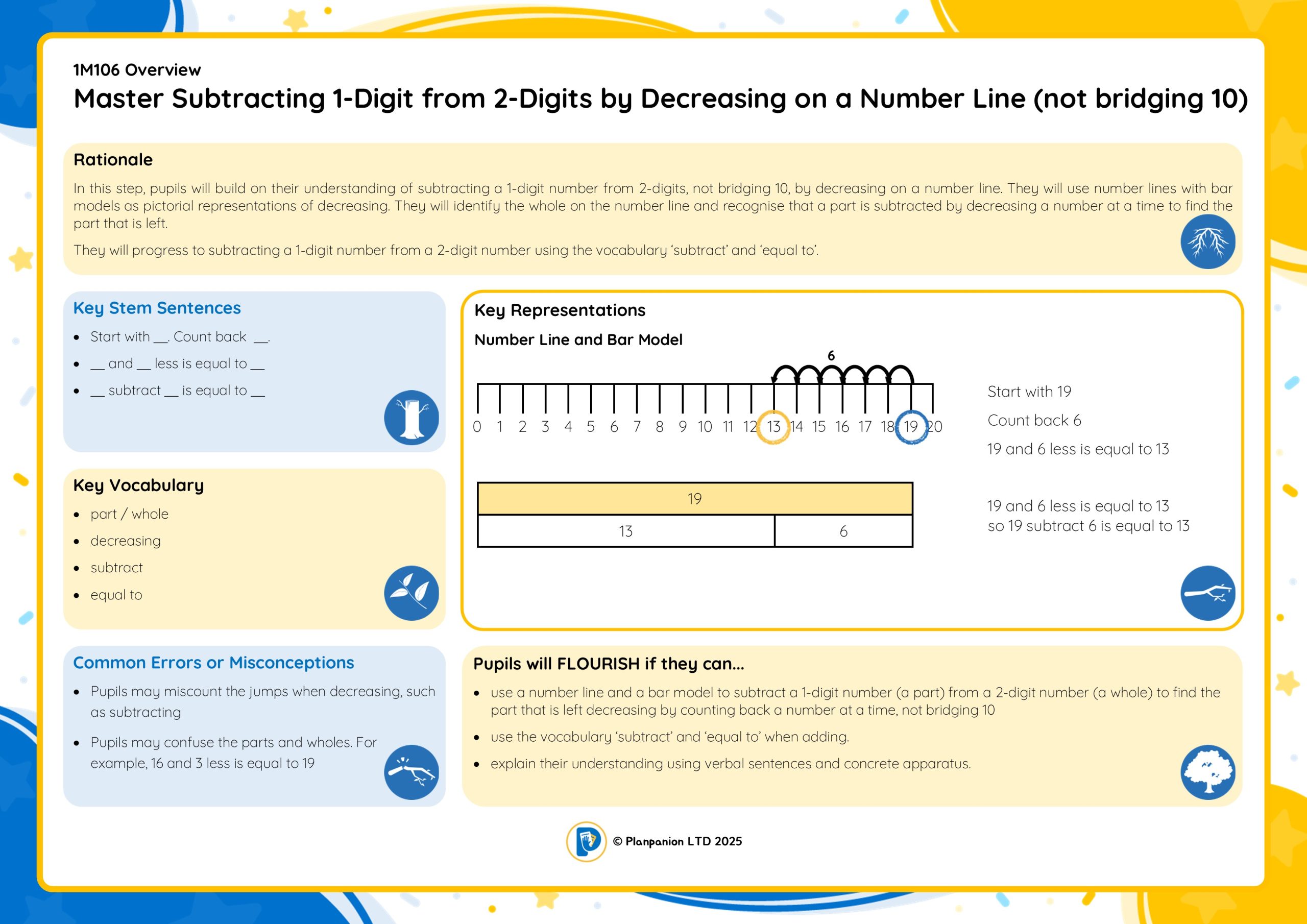 1M106 Master Subtracting 1-Digit from 2-Digits by Decreasing on a Number Line (not bridging 10)