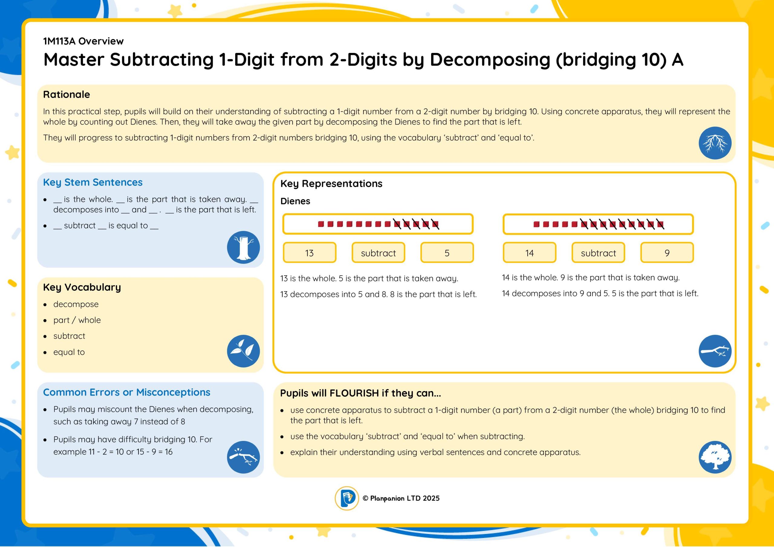 1M113A Master Subtracting 1-Digit from 2-Digits by Decomposing (bridging 10) A