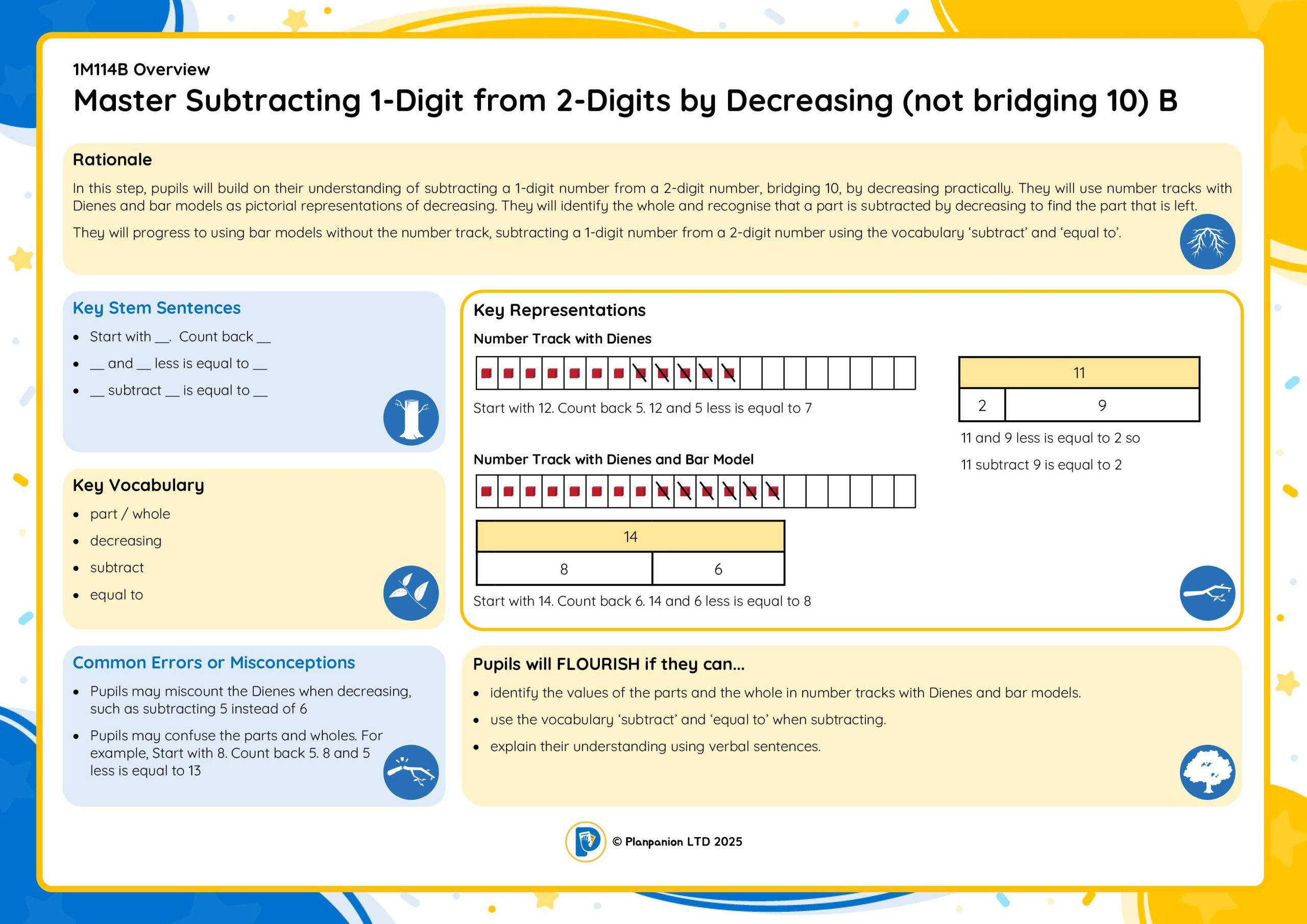 1M114B Master Subtracting 1-Digit from 2-Digits by Decreasing (bridging 10) B