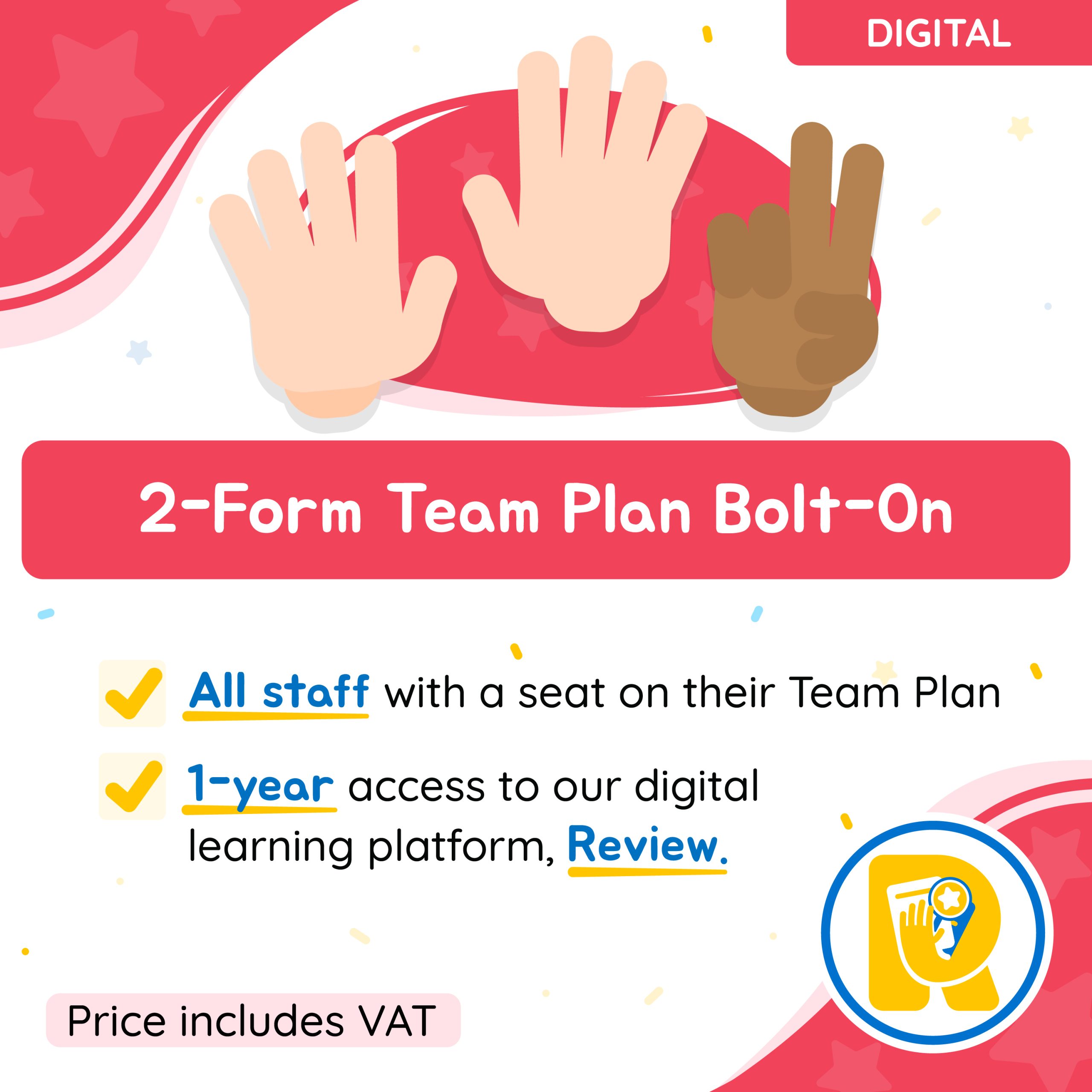 A ‘2-Form Team Plan Bolt-On’ grants all staff with a seat on their Team Plan access to our Review digital learning platform for a period of one year. It enables online homework, classwork and assessments to be assigned to pupils. After purchasing this Bolt-On online, a member of the Planpanion team will contact you once your subscription has been upgraded. This will include a user guide for Review.