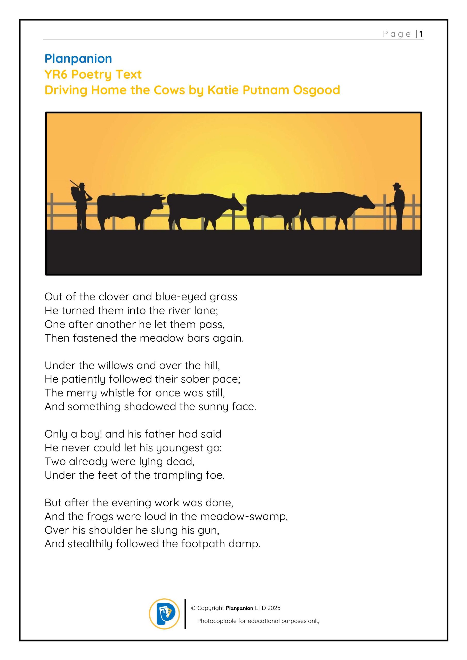 YR6 Driving Home The Cows Comprehension